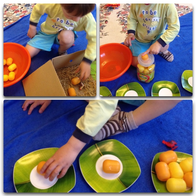 Миша собирал яйца, раскладывал на тарелочки по понятиям: ни одного-один-мало-много, складывал в сортер-банку.Повторяли семьи петух-курица-цыпленок и т. д. Играли в звукоподражание. Читали Курочку Рябу и выполняли задания на форму и цвет.