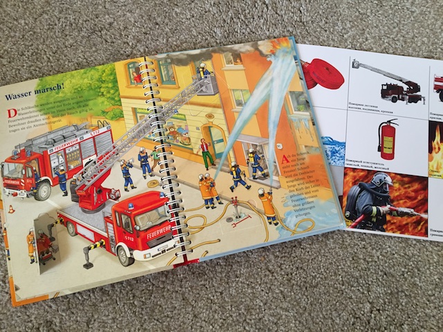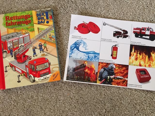 Произведений про пожар дома не нашлось, а в электронном виде мы не читаем, поэтому меня выручил отличный плакат из рассылки Елены. И наша книжка из серии Der, Die, Das, в которой очень подробно и интересно показаны основные особенности работы спасательных служб.