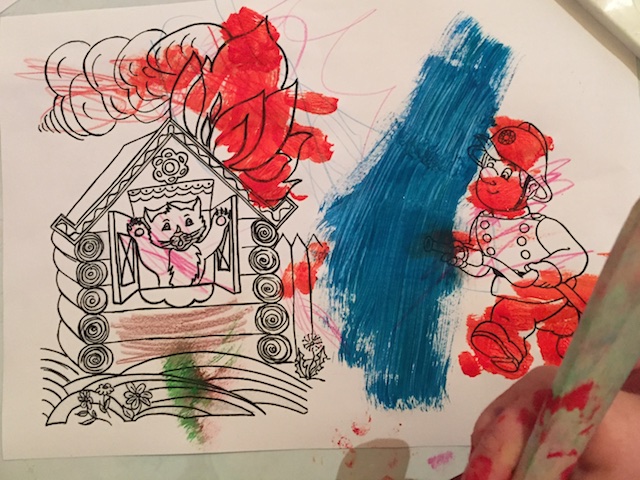 Сначала Настена сделала из пластилина "пожар", потом фломастером "потушила" (пластилин убрала). Дома и все жители остались целы! Ребенок был очень доволен.