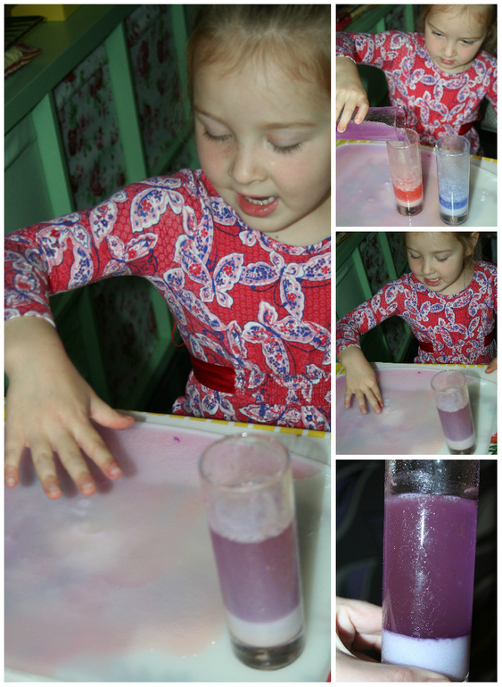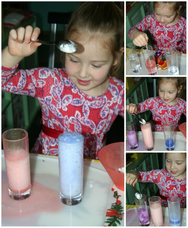 Дальше, конечно, поэкспериментировали с вулканами. Поскольку возле главного города Петропавловска-Камчатского их три, то и у нас было столько же. Уксуса я налила разное количество, но тем не менее все извержения состоялись :-)