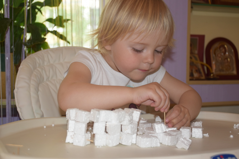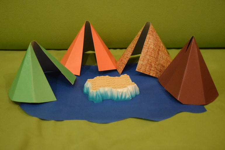 Сделали город. Я рассказала о том,что в горной местности бывают землетрясения и извержения вулканов. На вулкан М. посмотрела