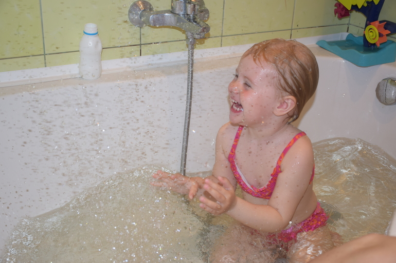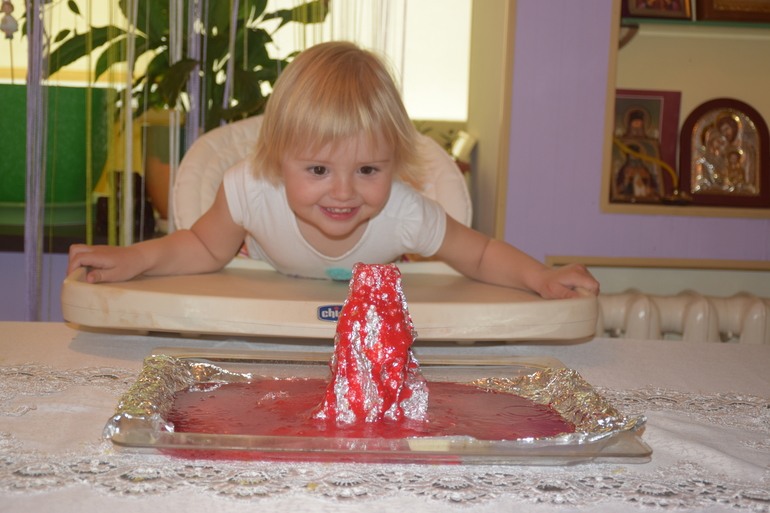 Я рассказала о гейзере. Посмотрели на пар.М. близко отказалась подходить. В ванной рисовали лаву и смывали её.