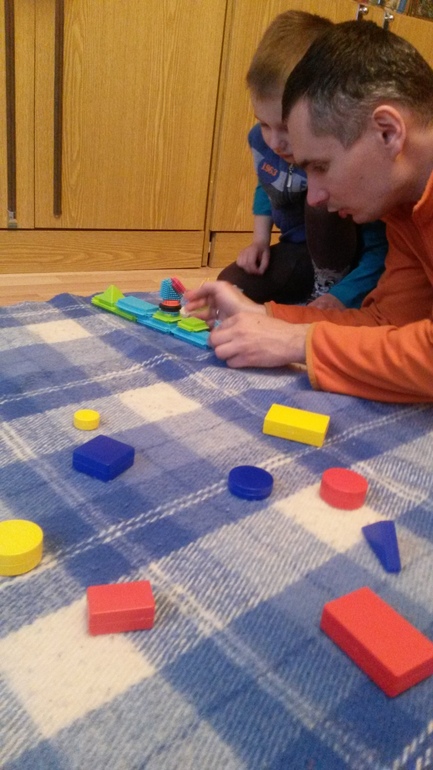 Раскидали по пледу наши любимые блоки Дьенеша. Это острова, которых много в Карибском море. Нам нужен остров Тортуга - база пиратов. Мы с папой по очереди задавали условия поиска острова. Родион отлично справляется, не выпуская из рук свой ледокол.