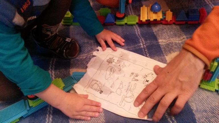 Вечером с помощью папы нам все-таки удалось выплыть в открытое море. Раскинули плед на полу, посмотрели карту мира, нашли Карибское море, Москву и полетели на самолете-амфибии(насмотрелись в парке). Сделали физминутку всей семьей.И вот посреди моря мы нашли бутылку, открыли ее, а в ней настоящая карта с указанием острова, где спрятаны пиратские сокровища.