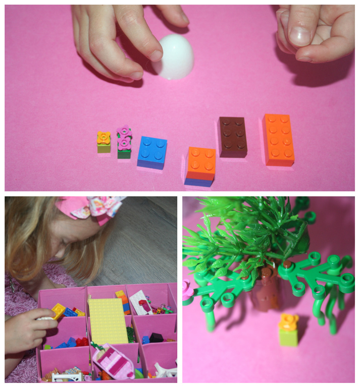 Разыгрывать сказку в лицах в этот раз решили с Лего, отобрали героев и даже гриб нашли, но он куда-то исчез, наверное, в корзинку к грибнику попал, и первому нашему герою - муравьишке пришлось срочно искать новое убежище от дождя. Камилка долго не думала и посадила его под куст. А вот над тем, чем отличаются муравей от бабочки, бабочка от мышки и т.д. в плане размещения их под грибом, поразмыслить пришлось, но потом все-таки поняла, что дело в размере, поэтому и кубики Лего выбрала сама довольно узнаваемо.