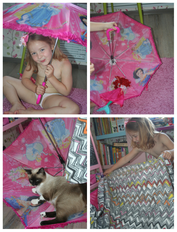 Опыт с дождем в банке тоже провели, правда, Камилка по названию ждала чего-то большего, поэтому пару секунд понаблюдала за каплями и унеслась дальше играть с зонтом и кошкой :-)