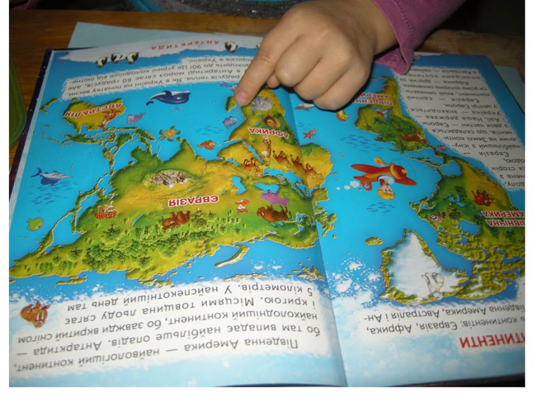 Почитали книги, я обратила внимание на то, что земля круглая, если ее раскрыть, то будет то, что на карте. Хотела шарик вчерашний использовать, но не получилось. Уже был выброшен к этому времени.