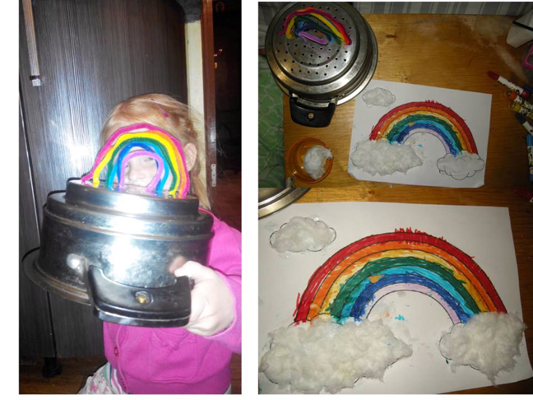 С радугой поиграли: повторили цвета. И сделали такую вот аппликацию+ разукрашка. Работа Вики