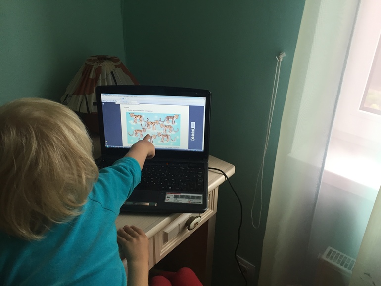 Сделали задания на ноутбуке. Удивительно, но Борюня первый нашёл одинаковых леопардов. Ещё он очень радовался тому, что в слоне был любимый: "Овал!!!"