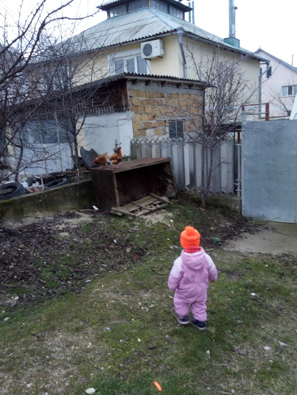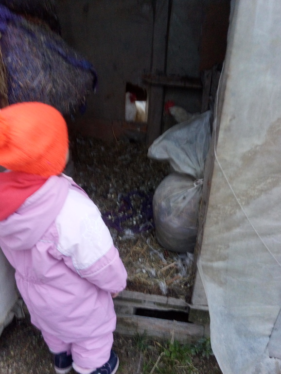 Мы живём в частном секторе и у нас есть немного своих кур. Пошли на улицу проведать их. Правда пока мы собирались куры легли спать) Пожелали им спокойной ночи, повторили что их домик называется курятник.