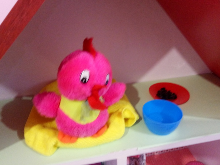 и решили что хотим посмотреть, как из яичек получаются цыплята. Мы взяли единственную среди наших игрушек курицу (весьма страшную), насыпали ей корм и налили воды,