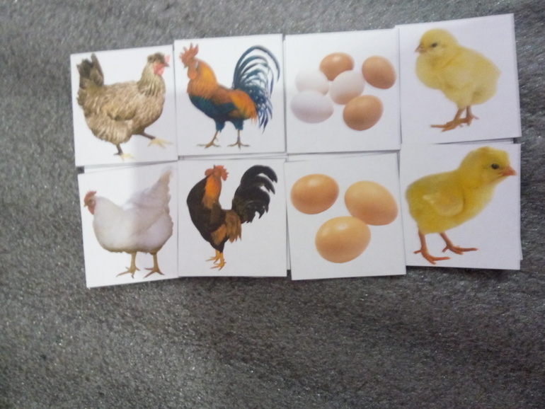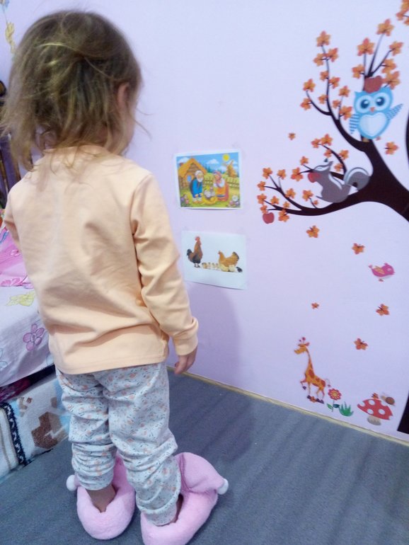 Итак, с вечера я прикрепила на стену возле кровати дочки картинку из сказки Курочка Ряба и изображение "куриного" семейства). Утром как только дочка проснулась мы пошли рассматривать картинки. Дочка рассказала кто там изображён, ответила на вопросы о том, как говорят эти птицы, что едят и какую пользу приносят людям.