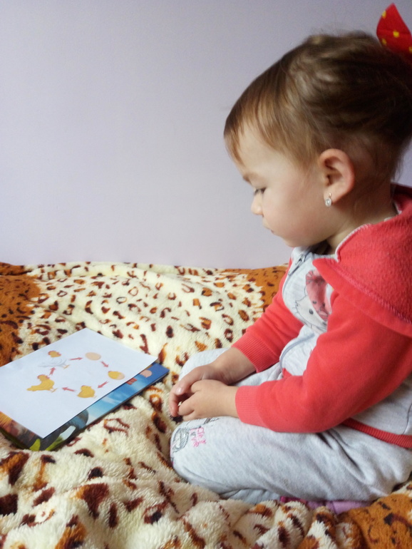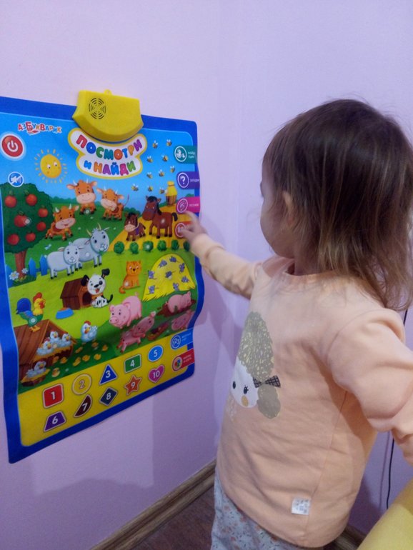 Пока я одевалась и красилась дочка играла с интерактивным плакатом (как раз на выходные подарили, я сама бы наверное выбрала тему посложнее уже, но к флешмобу он пришёлся очень кстати, да и дочка рада). Послушала ещё раз звуки курочки, петуха и цыплят, песенку про них, пробовала отгадывать загадки (и даже получалось).