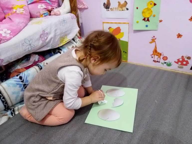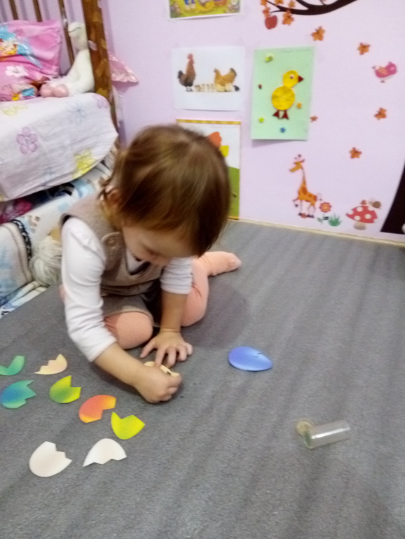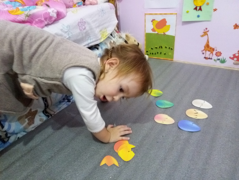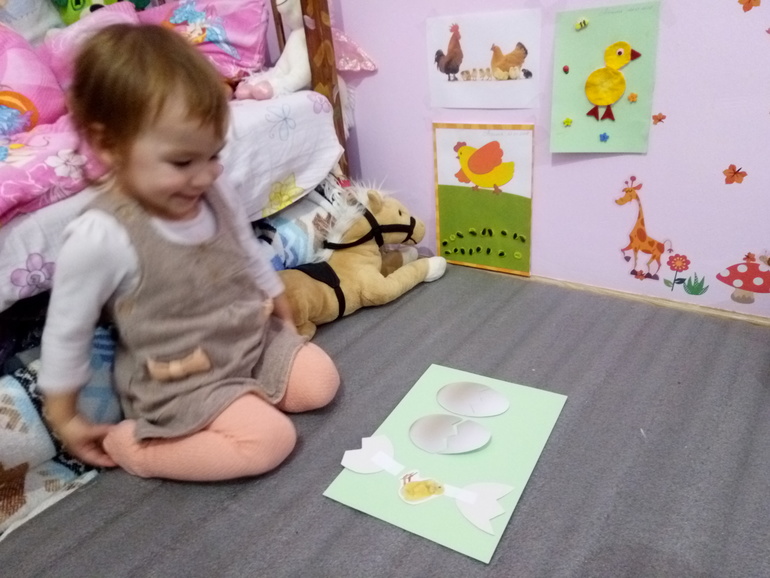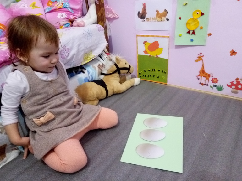Искали в каком яйце спрятался цыплёнок. Дочке очень понравилось, долго играли. Сначала она закрывала глаза, а я прятала, а потом поменялись)