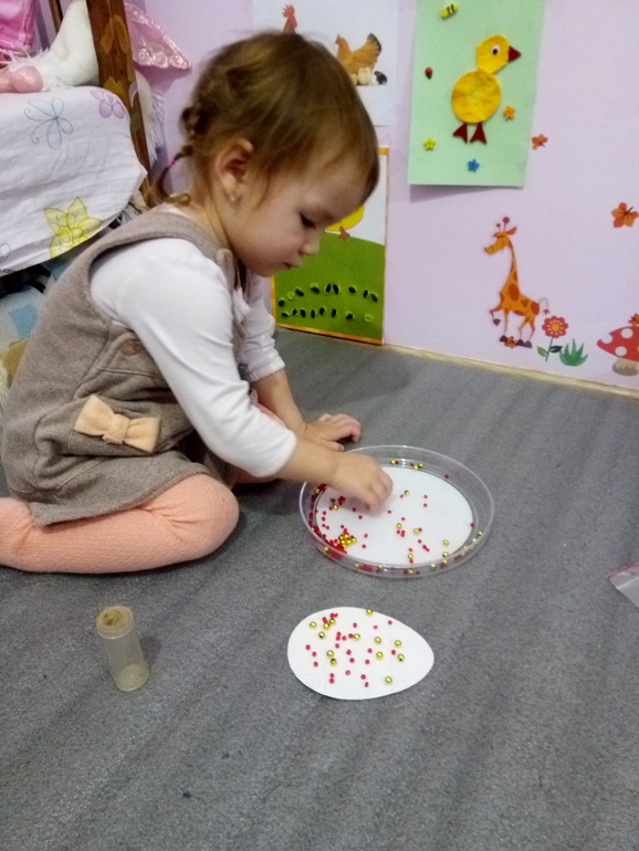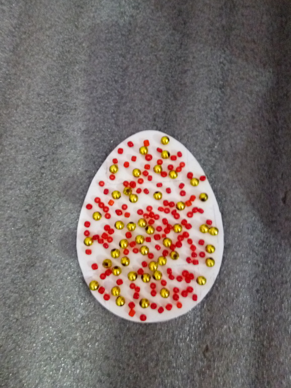 Кстати над моторикой с помощью бусин мы поработали прекрасно. Дочка достала коробочку с бусинами раньше времени и до начала процесса непосредственного украшения яйца раз 20 рассыпала их на пол и собрала обратно)