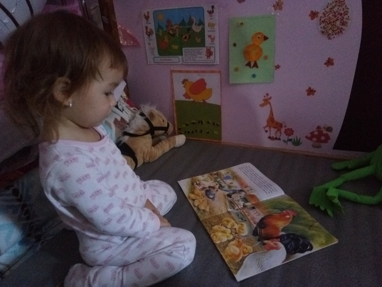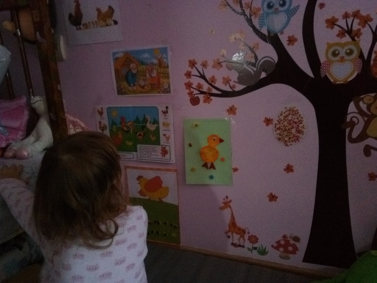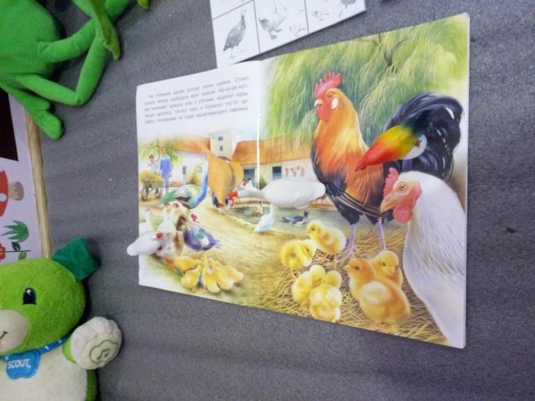 Утром рассмотрели и обсудили картинку птичьего двора. У меня в этот раз не было возможности распечатать цветной материал, так что почти всё черно-белое, а на стенку я приклеила разворот тоненькой книжки)