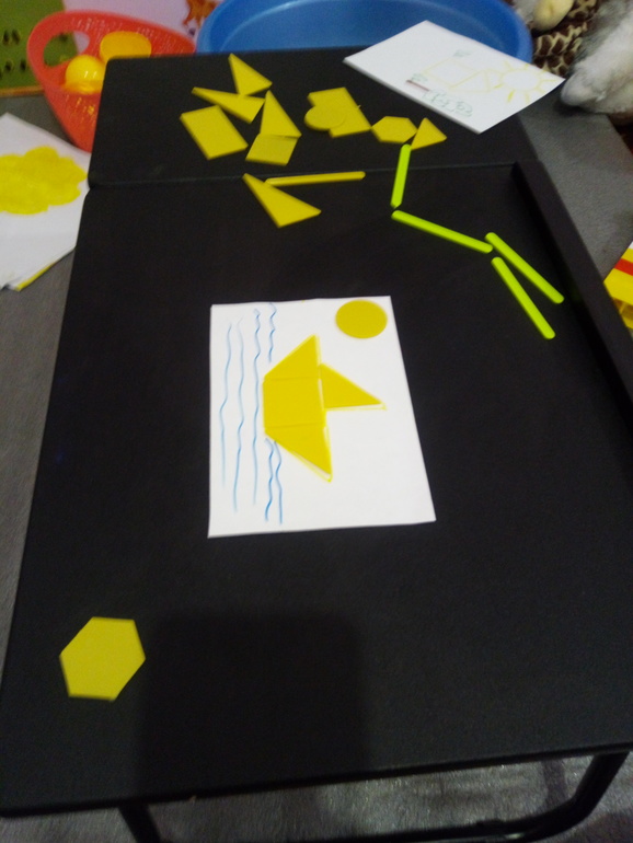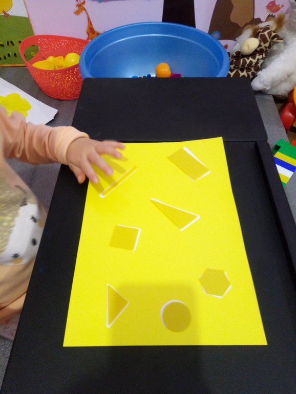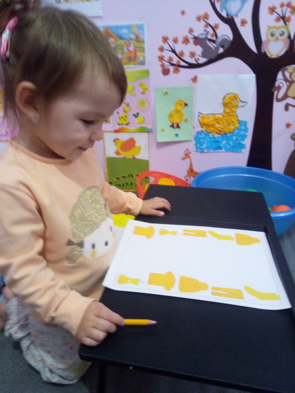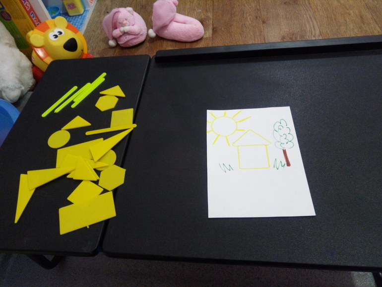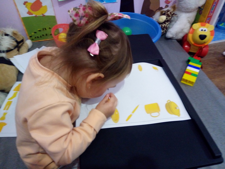 Рисовали дорожки между жёлтыми предметами. Заодно повторили названия одежды, посуды, понятия большой и маленький.