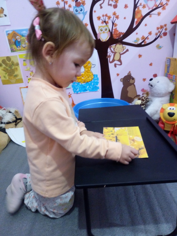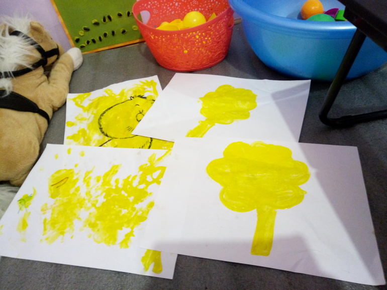 Потом дочка просила меня рисовать деревья и раскрашивала их желтым цветом. Потом просто ставила отпечатки руки на листочке