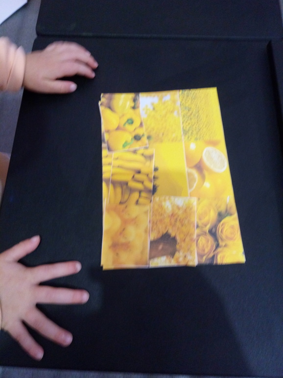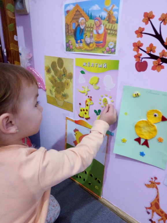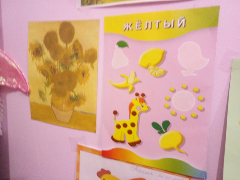 Начали конечно со стены. Туда в качестве примера жёлтого цвета мне приспичило приклеить "Подсолнухи" Ван Гога. Потом я подумала и добавила страничку из книжки с наклейками про цвета.