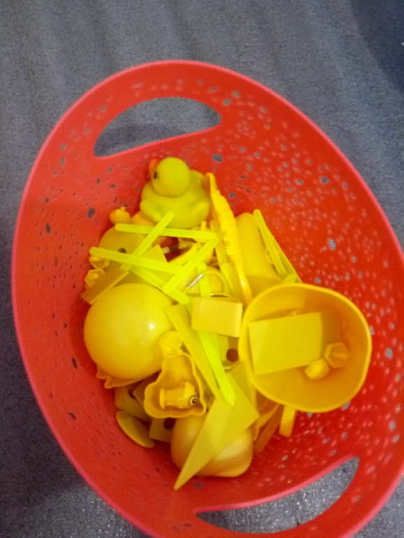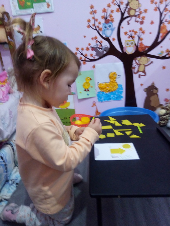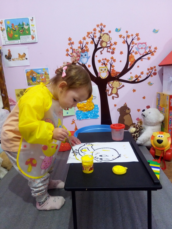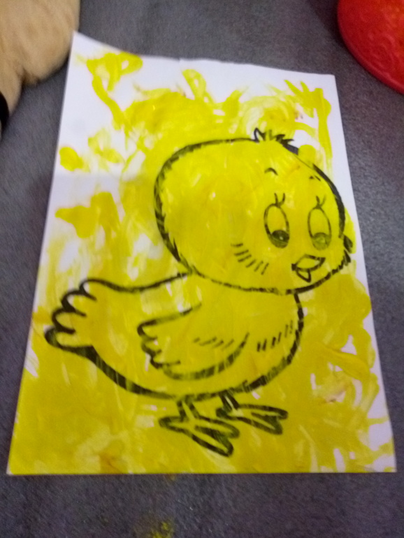 У дочки абсолютно отсутствует жёлтая одежда (только трусы есть жёлтые 😊). Зато мы надели наш любимый фартук для рисования. Рисовали конечно желтым цветом. Сначала дочка раскрашивала цыплёнка