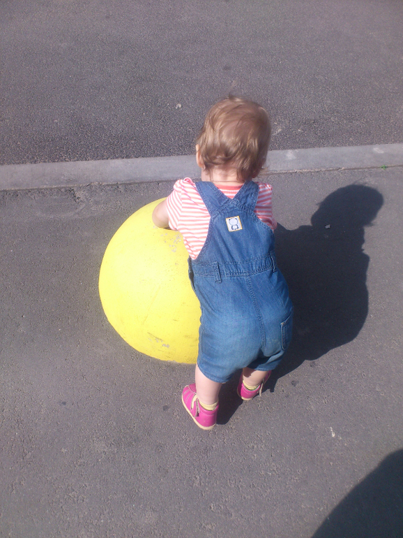 а тут учудила...ходили на озеро уток кормить, устали, поехали домой...в велике не сидит, на руках тоже, пешком не идет...стоим посередине пути...прижалась к стене и довольная