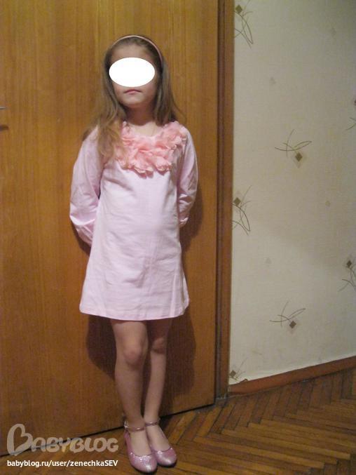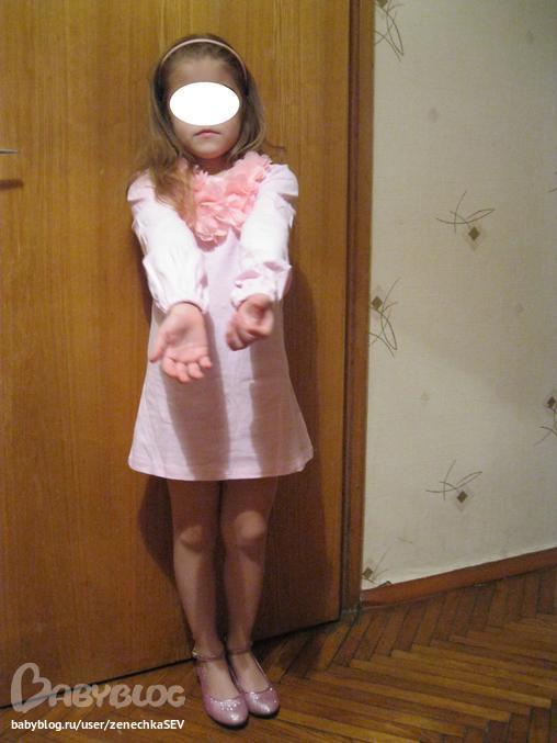Платье брали р.130. Само платье по цвету немного отличается от цветочков на платье. Я считаю, что платье маломерит на размер. т.к. р.130 оказался нам впору (ну чуть с запасиком). Вот мерки: длина платья 57см, длина рукава 43см, полуобхват в подмышках 34см.