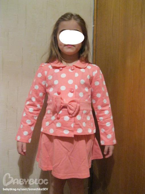 . Качество очень понравилось. У дочки рост 117см. Брали костюм р.120. Он трикотажный. Более насыщенного цвета, чем на фото. Сел очень хорошо. Правда юбочка могла бы быть и подлиней, но это больное место всех юбок. Вот мерки: длина юбки 25см, длина рукава пиджака 41см, полуобхват в подмышках 34,5см, длина спинки 38,5см. На фото он мятенький, не успели отгладить).