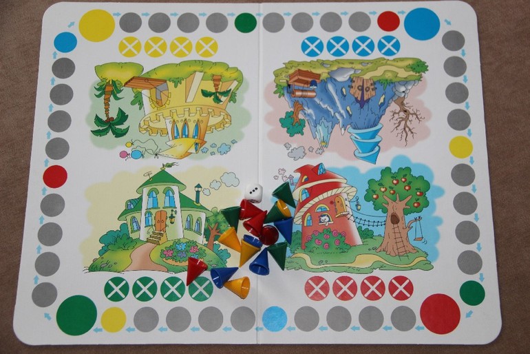 Сначала немного о качестве. Была приятно удивлена когда получила эту игру (заказывала наверно года 2 назад). Поле двухстороннее из толстого слегка ламинированного картона. Колпачки из хорошего гладкого пластика, кубик обычный.