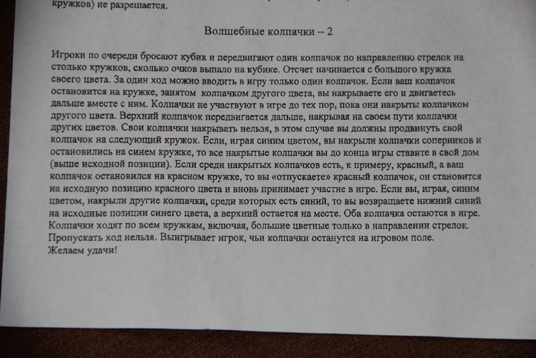 Если верхний, например синий колпачок, накрывает башню, где уже есть один синий колпачок, то нижний синий из башни изымается и начинает игру из домика сначала. Если играют три игрока, то башня может состоять максимум только из трех колпачков. Вот вообщем то и все правила - сфотографировала родные из игры: