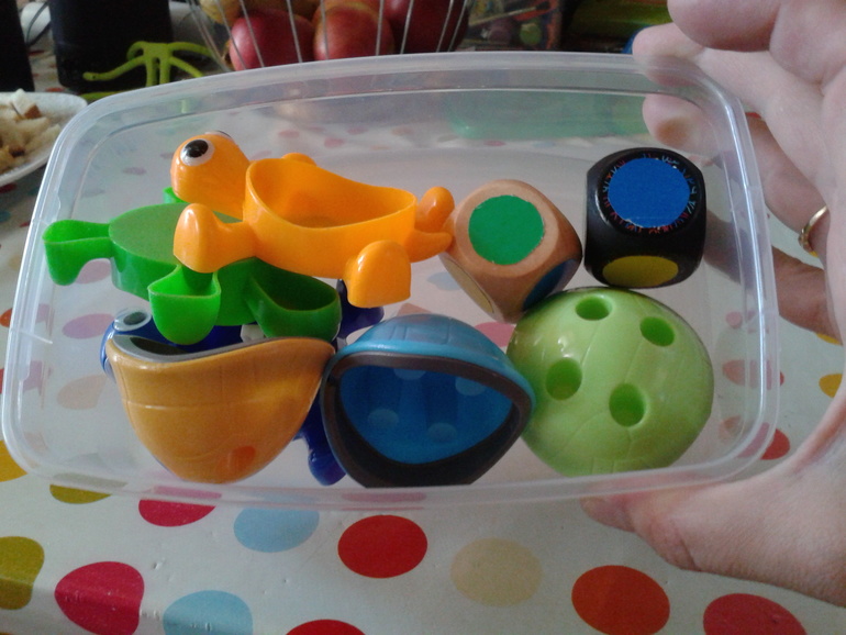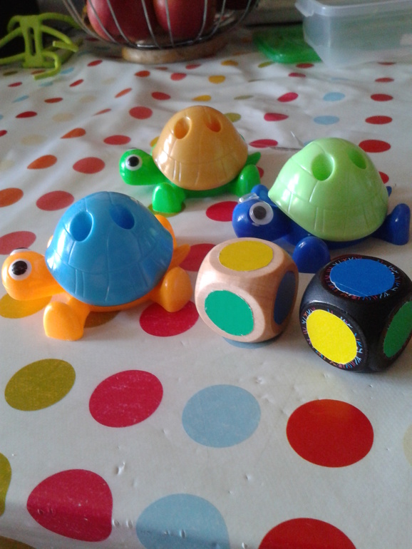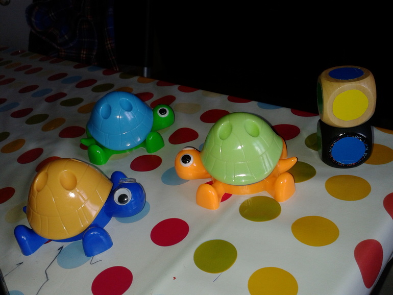 Поставьте черепашек в центр стола и нарядите их в панцири любого цвета. Перемешайте карточки с черепахами и положите их картинкой вниз на столе. Игру начинает самый младший игрок. Он берет одну карточку и сравнивает ее с черепахами на столе. Если у одной черепашки присутствует такая комбинация цветов как на карточке, игрок забирает эту карточку себе. Если нет - кладет карточку обратно в колоду. Затем игрок меняет панцири у 2 или 3 черепашек. После этого ход переходит к другому игроку. Игра окончена, если один из игроков собрал: 4 карточки при игре 4 человек, 5 карточек при игре 3 человек, 6 карточек при игре 2 человек..Эта простая и веселая игра очень нравится детям и украсит любой детский праздник.