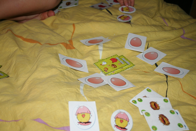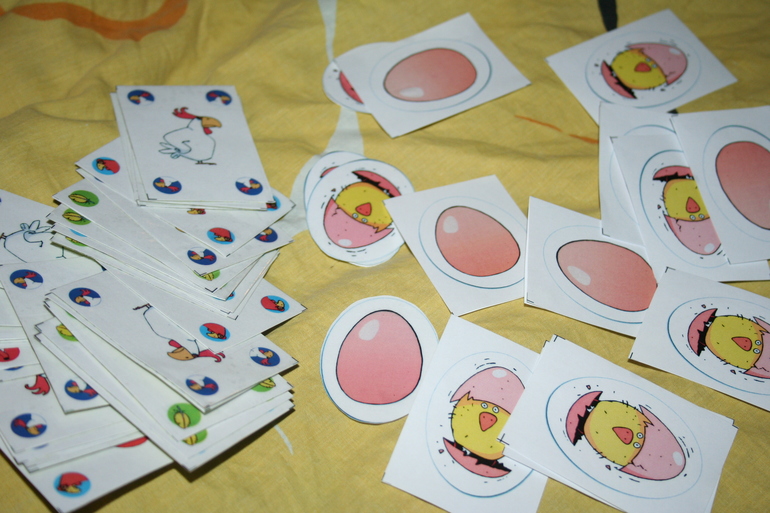 Сразу как только мы уселись поиграть, стало понятно, перед нами нечто особенное :-) Нет, ну, правда, такие интересные правила! Всего 4 типа карт: курица, петух, гнездо и лиса, а еще отдельная стопочка яичек. Цель игры - вылупить трех цыплят, а для этого нужно собирать разного рода комбинации карт и вести хитрую кампанию против противников. Например, картой лисы можно похитить яичко у соседа, но если сосед имеет на руках две карты с петухами, то он сможет отбить яичко и прогнать лису :-) И вся игра строится вот на таких интересных ходах. Ну, а вылупление цыпляток под забавные звуки "куд-куда" делает ее не только захватывающей, но еще и очень смешной :-) Камилка обожает эту игру и НИКОГДА не проигрывает, не знаю в чем тут дело, но кроме нее еще никто ни разу не победил, хотя мы очень стараемся :-)