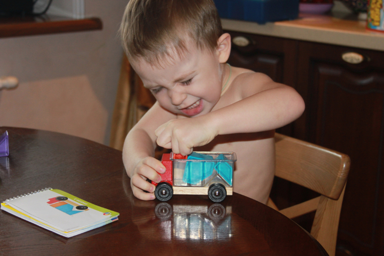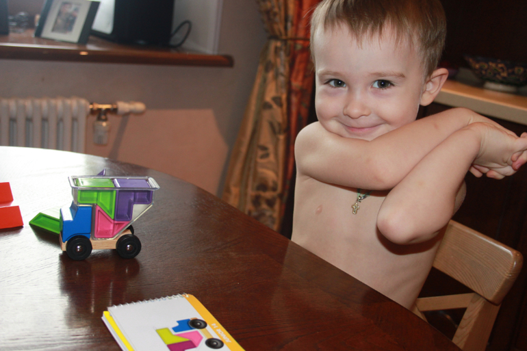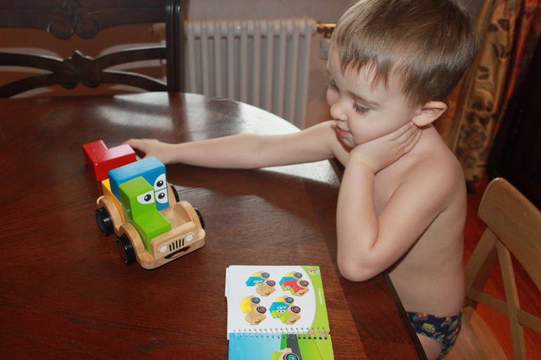 Все детали из дерева, очень качественные, тяжеленькие. Смысл игры по приведенным схемам уложить фигуры. Если брать для более маленьких пользователей, то можно просто складывать как душе будет угодно и перевозить. Машинка не убиваемая.