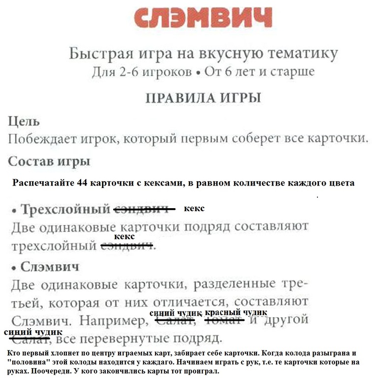Количество карточек можно увеличить с 44 (по 4 карточки каждого) до 66 (по 6 карточек) Правила схожи с игрой Слэмвич