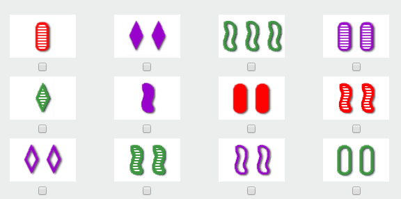 головоломки, логические игрыЯ недавно писала, что приобрела-таки "Сет" в домашнюю коллекцию. Интереснее, конечно, играть с соперниками, но это если только в выходные, а в будни я, бывает, раскладываю карточки одна. В одиночку интересно время засекать. И вспомнила я тут давний пост Loridan об игре и упоминание в нем on-line версии. Нашла. Сегодняшнее задание выглядит вот так (вернее, оно наверное вчерашнее, я так поняла, что новое будет в 12.00):