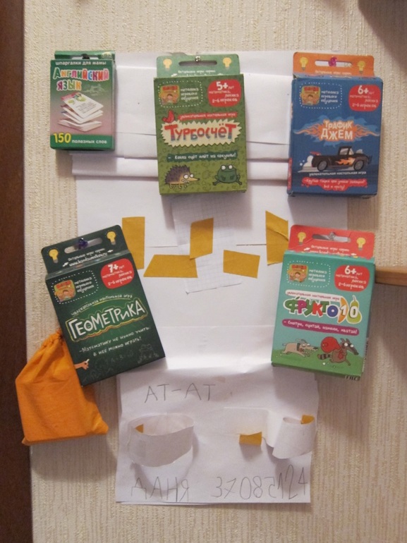 Я давняя поклонница игр «Банды умников». Это развивающие и обучающие игры по математике, а сейчас создатели решили затронуть и сферу чтения. Данька третий месяц не расстается с новой игрой и заставляет всех с ним играть. А недавно на ребенка напало вдохновение и он создал в прихожей вот такую композицию. Какая-то сложная смысловая конструкция, каждый листок что-то значит, я так еще и не разобралась, что к чему (знаю только точно, что значит АТ-АТ - это такой корабль Lego из серии «Звездные войны»).
