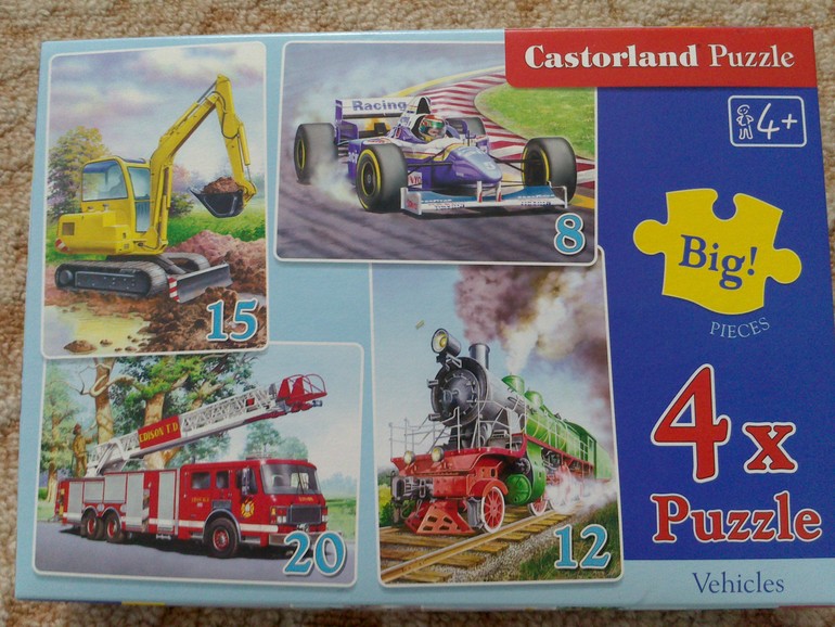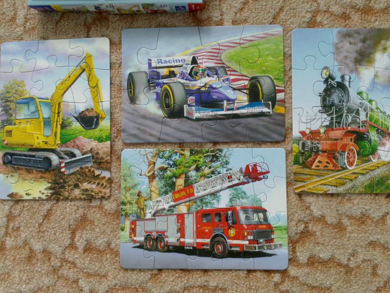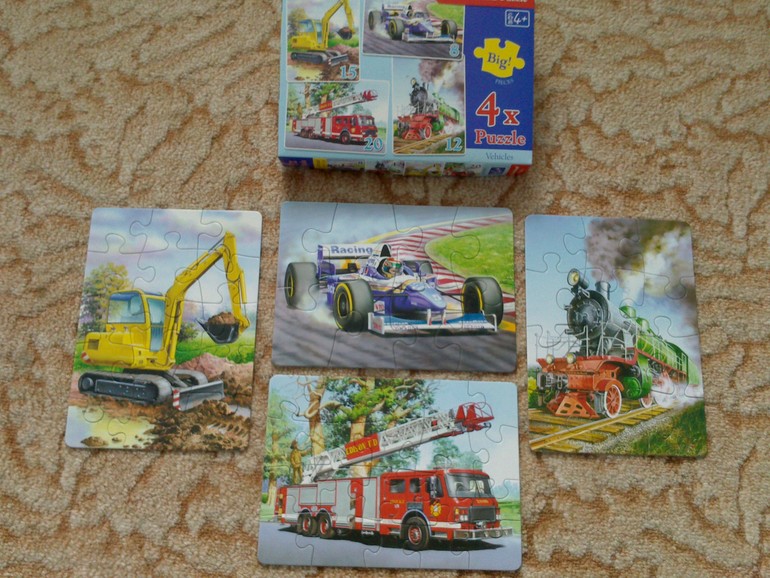 Не могу нарадоваться приобретению этих пазлов. Сын (3-х летний поклонник машин ) в абсолютном восторге.Собирает каждый день на протяжении недели)))Набор отличного качества,состоящий из четырёх картинок по 8,12,15 и 20 деталей размером 23х16,5 см.