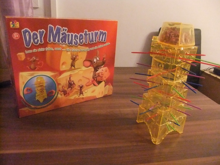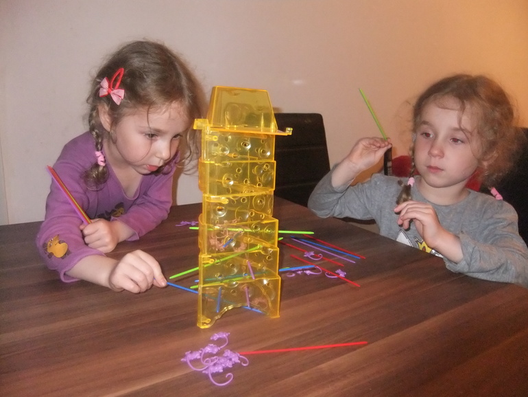 Правила: палочки вставляются в башню так, чтобы образобались перегородки на всех уровнях, "выпускаем" мышек из камеры (она закрепляется наверху башни), и начинаем вытаскивать палочки. Мышки, которые проваливаются, забираются игроком. Выигрывает тот, у кого в конце игры меньше мышек.