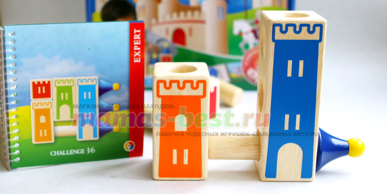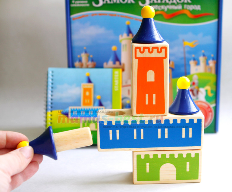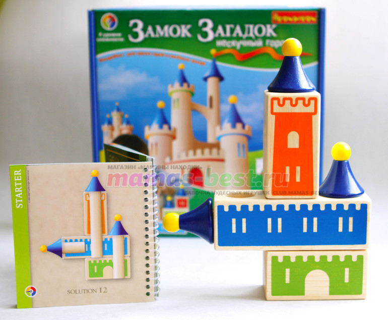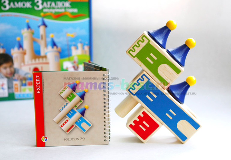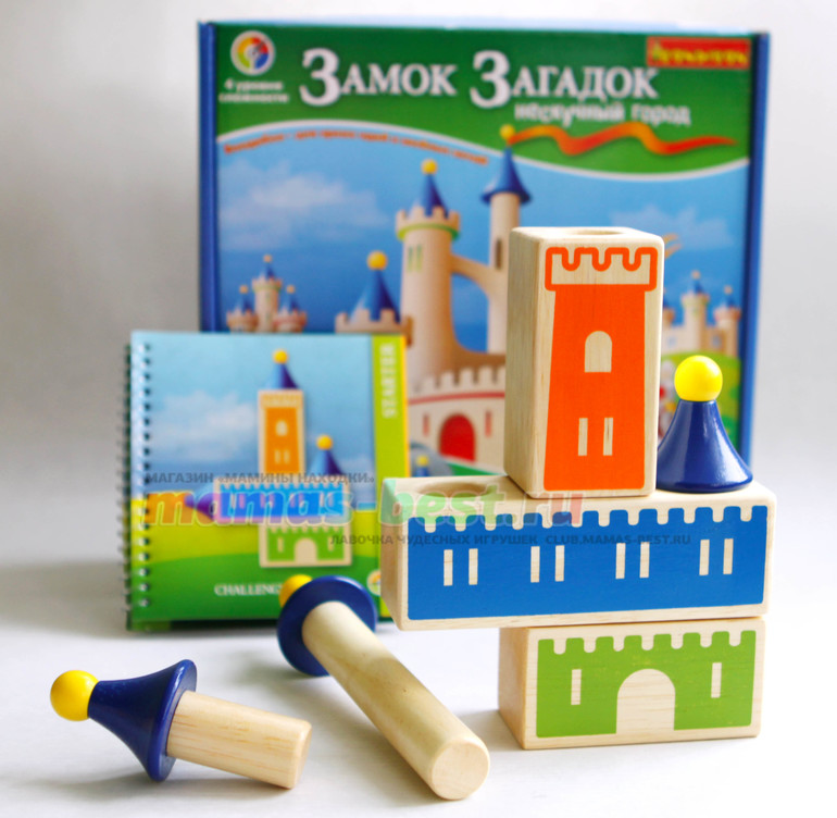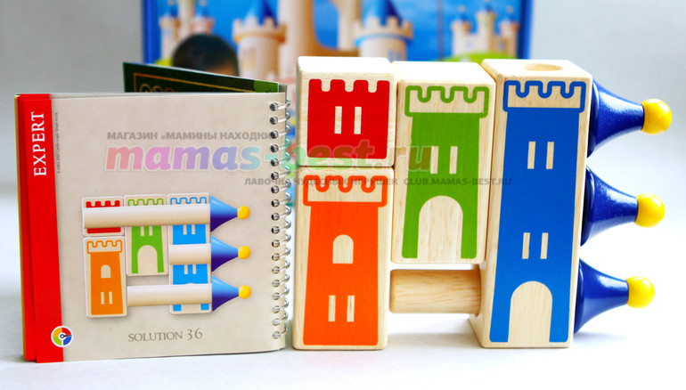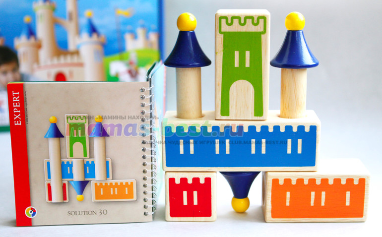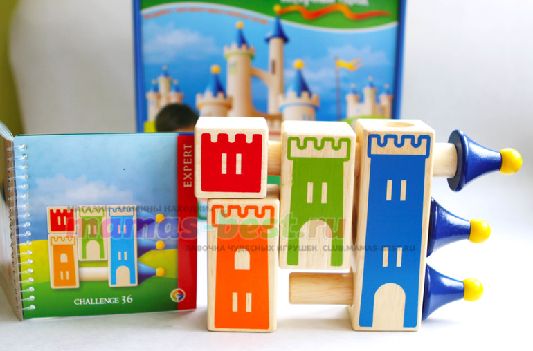 4 деревянных блока, три деревянные башни, буклет с заданиями и решениями, инструкция.