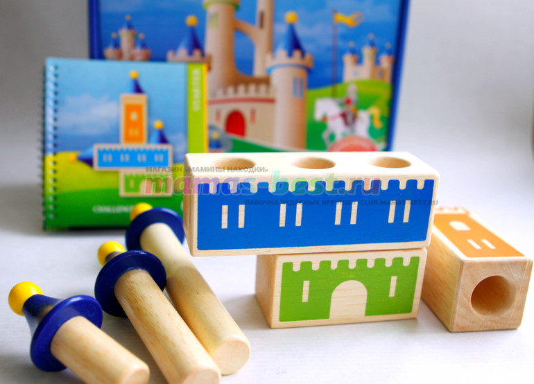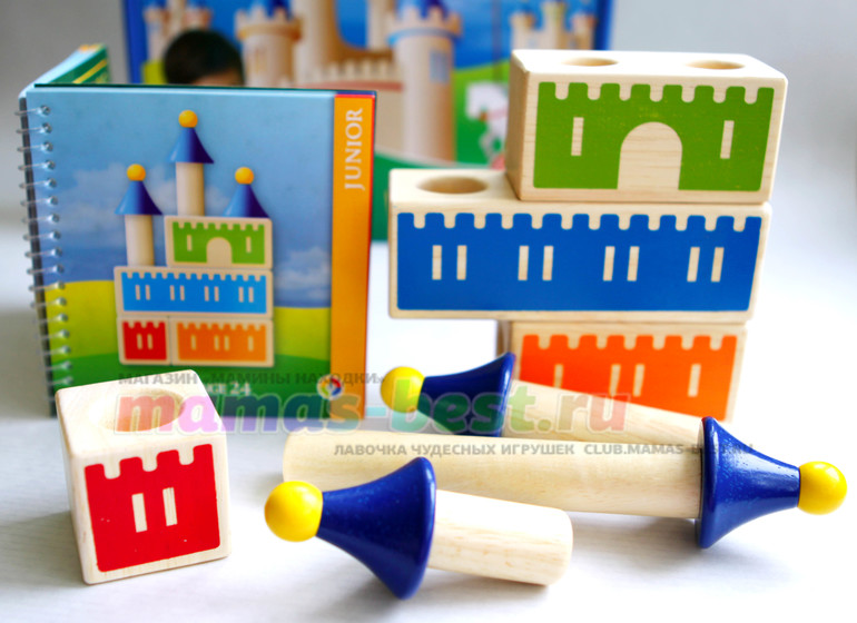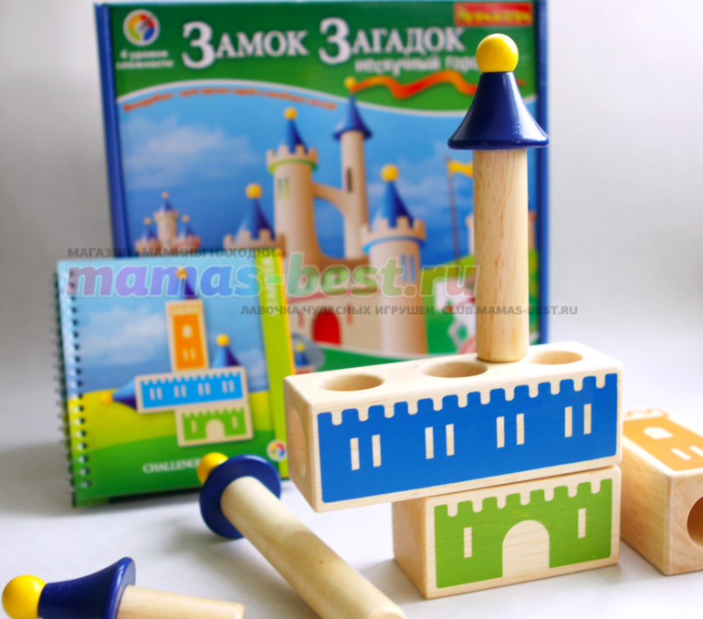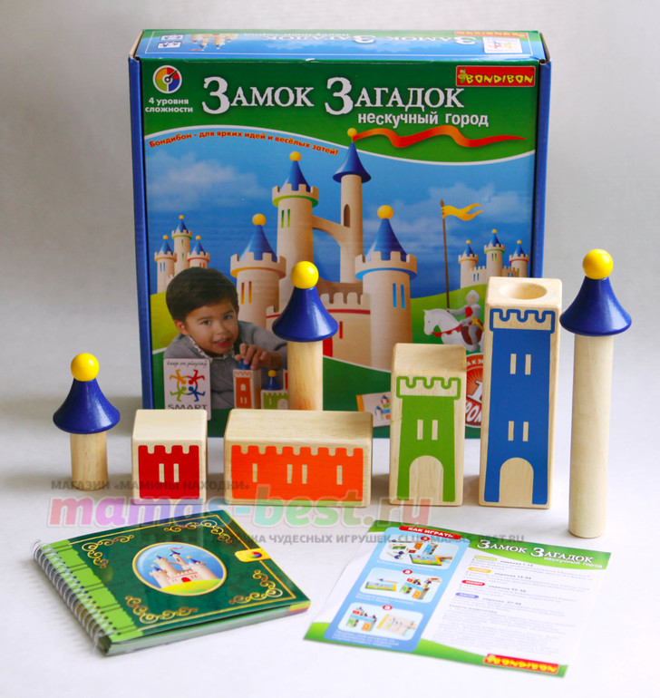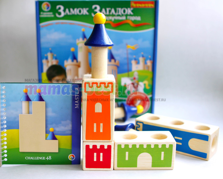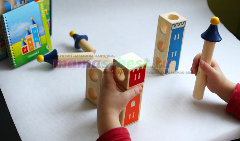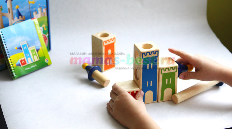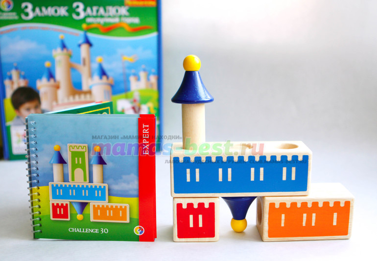 4 деревянных блока, три деревянные башни, буклет с заданиями и решениями, инструкция.