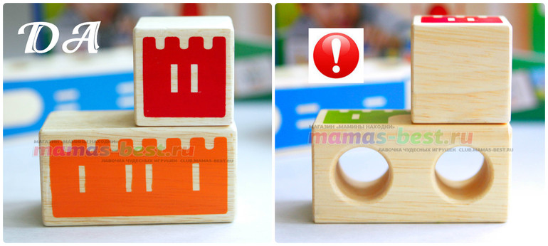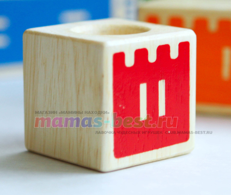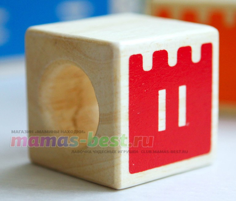 Самый маленький блок имеет одинаковые красные рисунки на обеих гранях, однако ориентация рисунка относительно отверстия на этих гранях отличается.