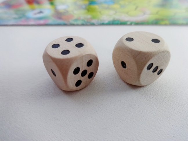 Кубики в игре нестандартные, я не сразу заметила ))). На одном по два раза встречаются значения 1, 2 и 3, на другом - 1, 4,5. Очень интересное решение.