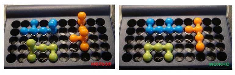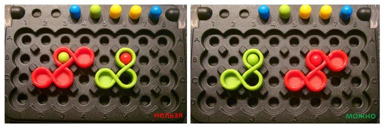 Здесь появляются вспомогательные детали - разноцветные фишки (я их называю "пенечки")), которые определяют расположение на поле цветных элементов. А именно: пенечек красного цвета может располагаться только под красной деталью, зеленого - под зеленой и так далее. Вот так:
