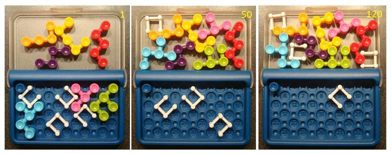 Задача игрока разложить на поле оставшиеся, незадействованные элементы (они выложены на крышках). Как видите, чем сложнее задание, тем меньше элементов расставлено на поле с самого начала и тем большее их количество нужно разложить самому: