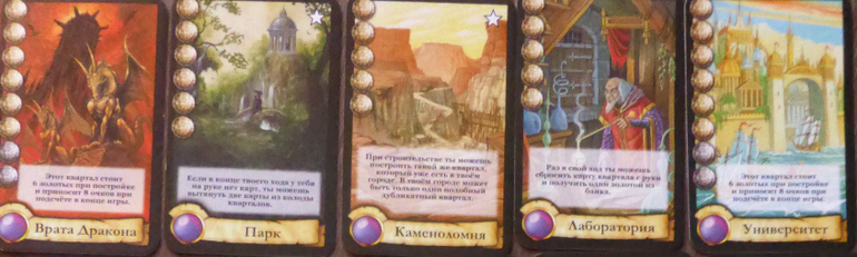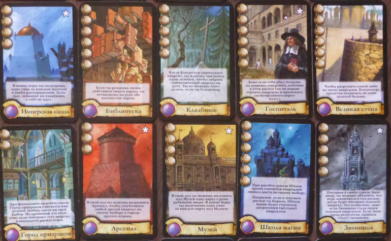 Потом - строить только из дорогих карточек. В принципе, стратегия правильная. (выигрывает тот, у кого больше очков. Но в реальности в игре без дополнений редко выиграет не тот, кто закончил выкладку 8 карт - 4 призовых балла решают все, а если еще и 3 за разноцветность - то ты на коне. В игре с дополнениями собрать все 5 типов карт разных цветов почти невозможно, а фиолетовые стоят довольно дорого, поэтому роль денег тоже повышается).