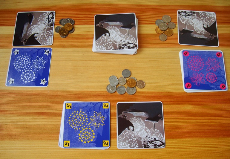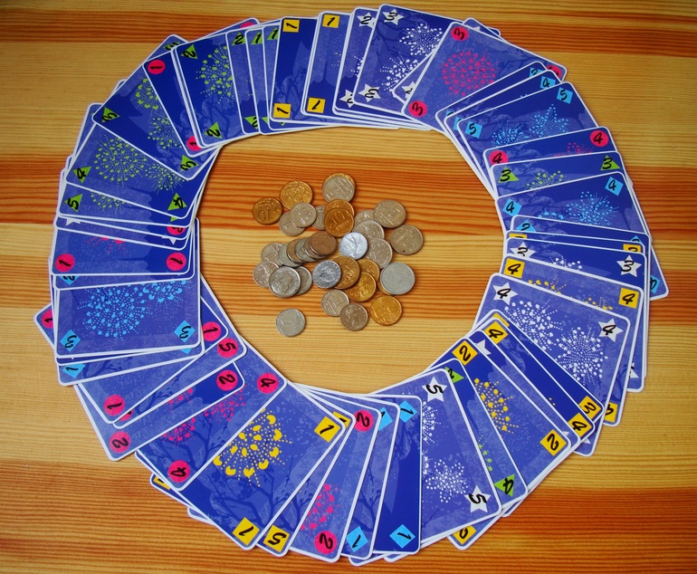 Подготовка к игре. В зависимости от количества игроков, раздается по 4 или 5 карт фейерверков, красные и голубые жетоны выкладываются в центре стола: