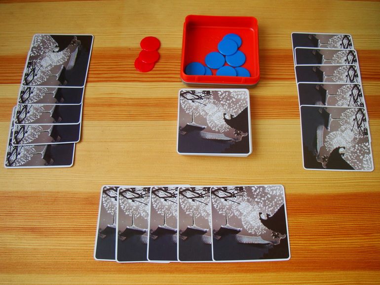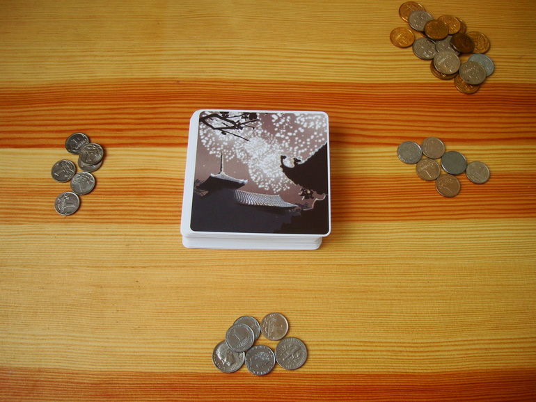 Карты перемешиваются и кладутся стопкой в середину стола, рубашкой вверх. Каждый игрок (их может быть до 5 человек) получает по 6 монеток (каждая номиналом 1 очко). Оставшиеся монетки образуют своеобразный банк. Первоначальная раскладка для трех игроков: