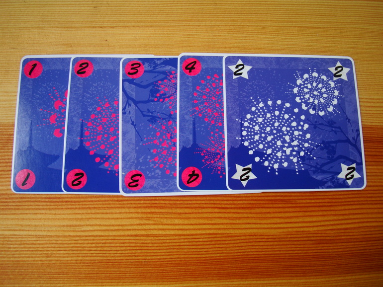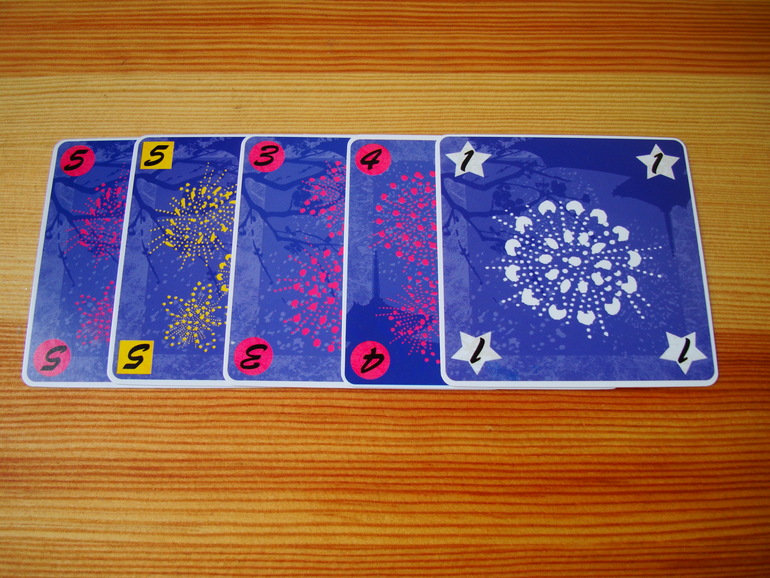 - Выложить карту в цепочку фейерверка. Для этого игрок выбирает свою карту и выкладывает ее открыто на стол. Выложенная карта может продолжить уже начатую цепочку фейерверков. Например, белая карта с "4" продолжит белый фейерверк: