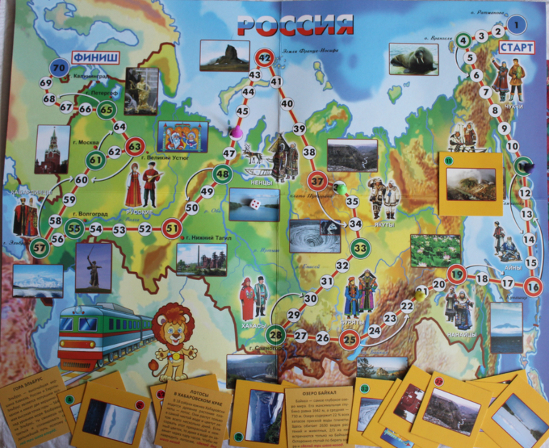 Попадая на зеленый или красный ход, игрок получает карточку с информацией об уникальных объектах России и имеет возможность продвинуться вперед или вернуться назад. Кстати, у этого производителя серия образовательных игр такого плана.