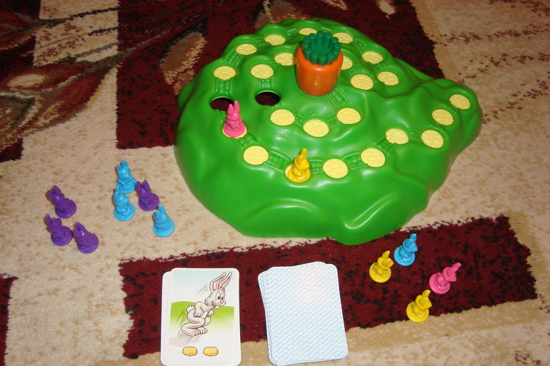 В комплекте большая зеленая поляна. Цель-первым дойти до морковки. Каждый игрок берет себе 4 зайца одного цвета.