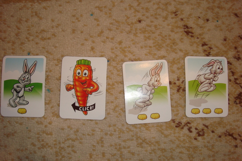 Карточки показывают количество прыжков, а морковка на карточке означает, что нужно повернуть морковку на игровом поле до щелчка. При этом в разных местах появляются ямы и зайцы могут улететь вниз. Можно играть сразу четырьмя зайцами, продумывая ходы, а можно брать нового взамен улетевшего в яму.